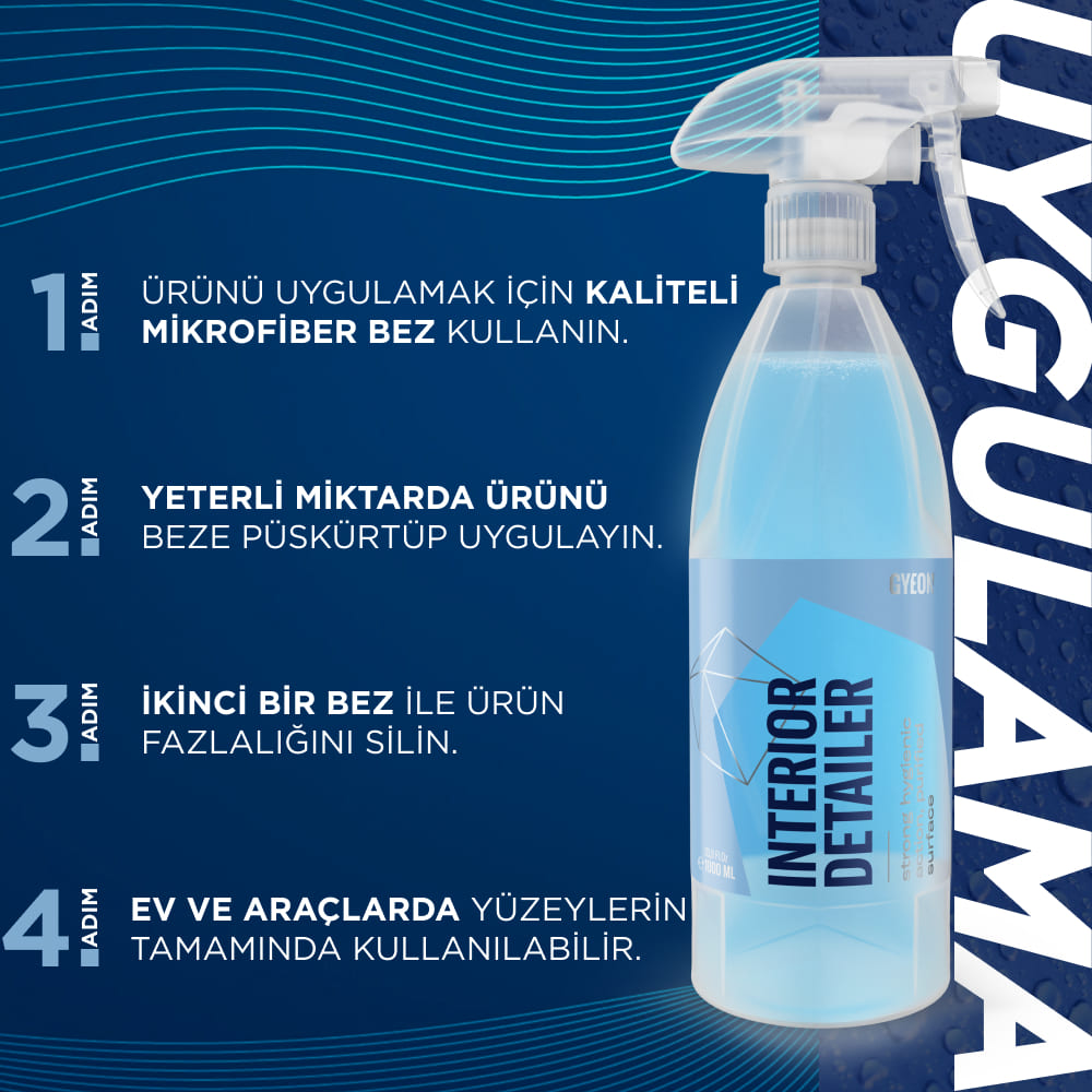 Aracınızın içini saniyeler içinde hem ferahlatan hem de %60 alkol içeriğiyle bakteri ve virüs tehdidini ortadan kaldıran pratik bir bakım spreyi düşünün. Q²M InteriorDetailer, deri koltuktan dijital ekrana kadar her yüzeyde günlük kiri sökerken mat, yağsız bir dokunuş bırakır; yolculuklarınızı daha temiz ve hijyenik kılar.