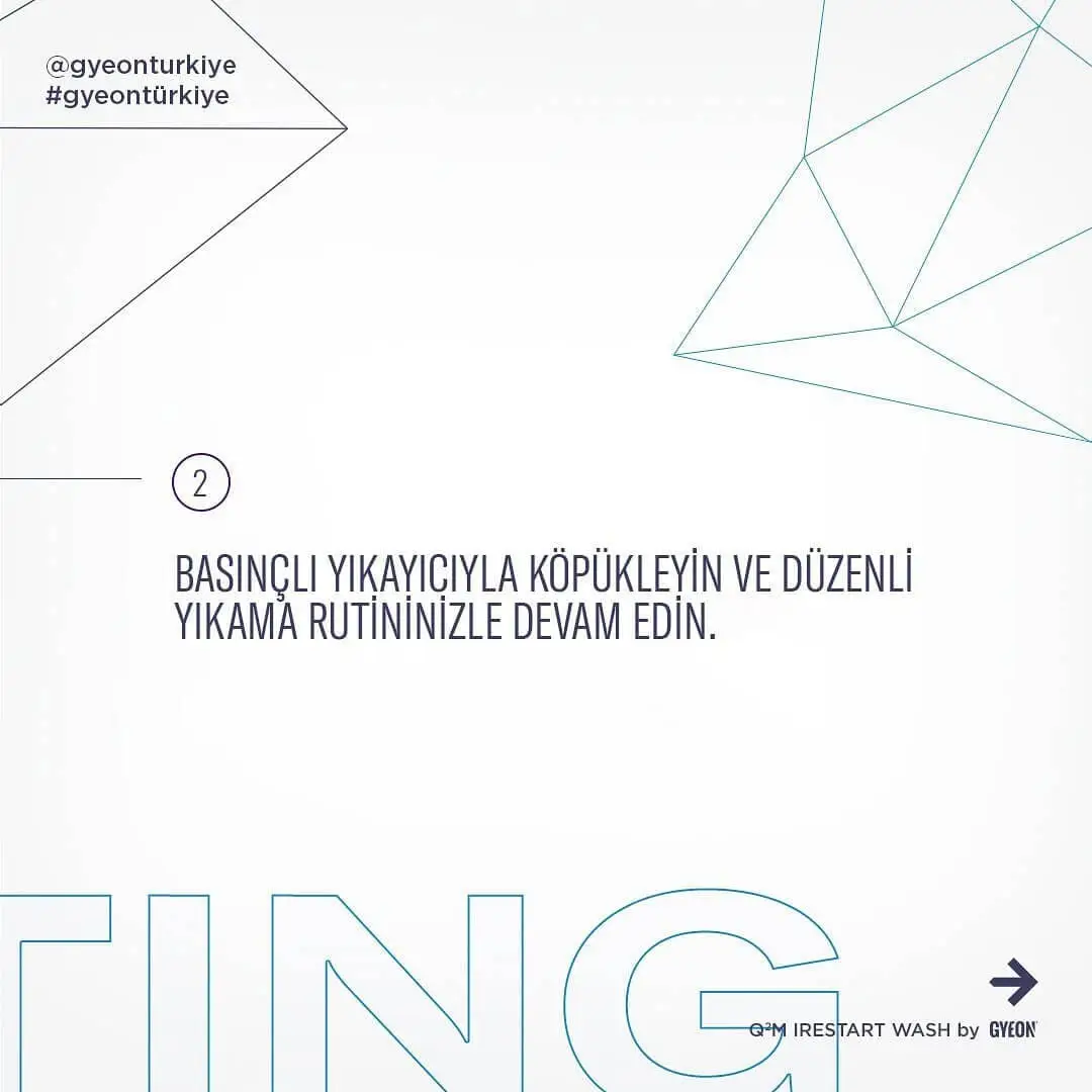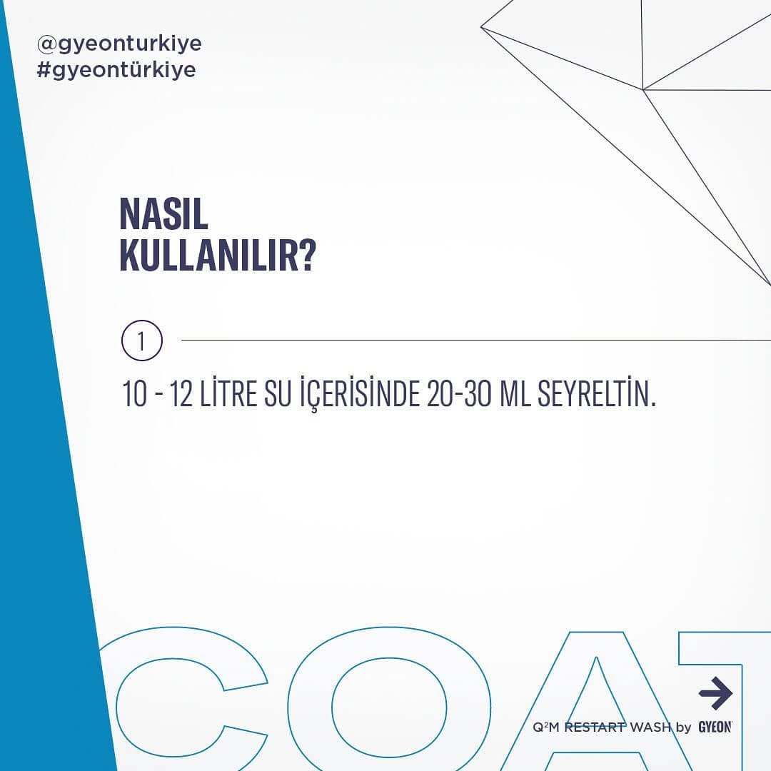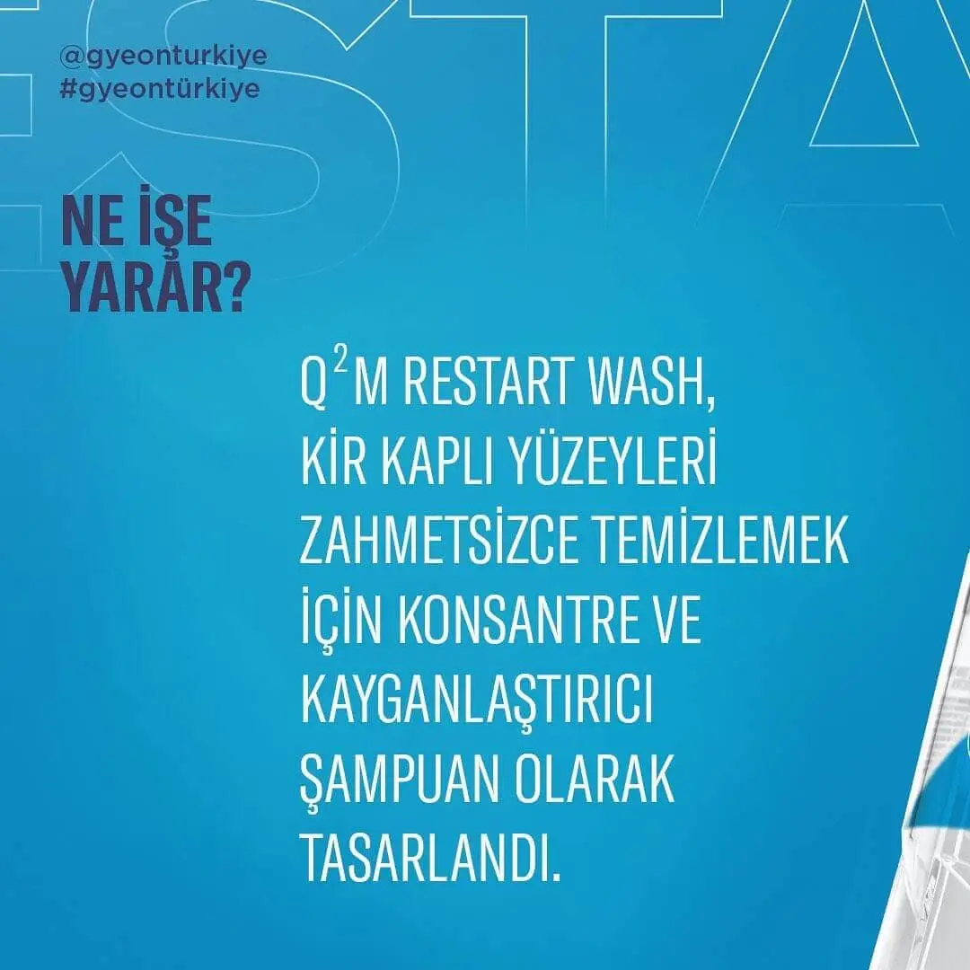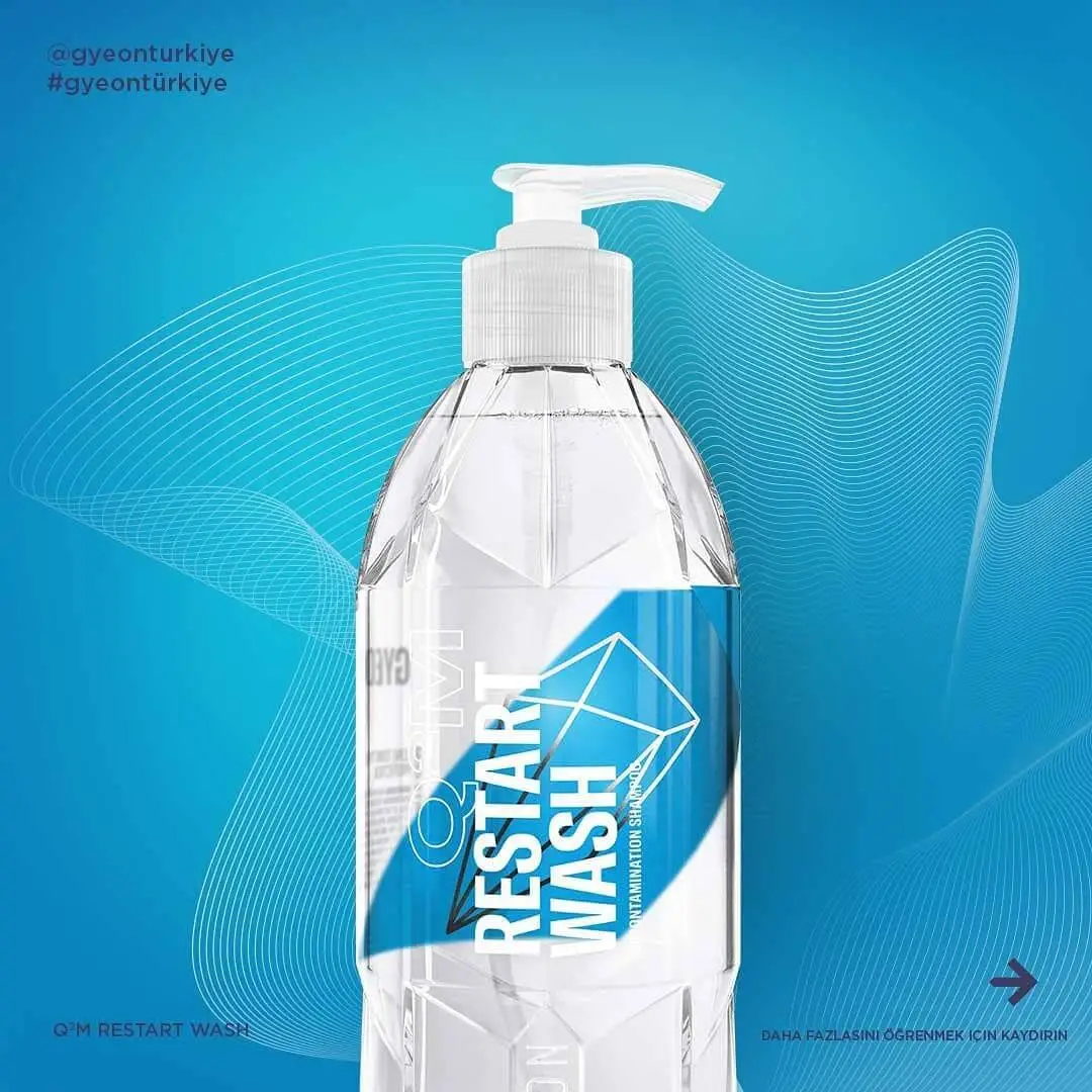 GYEON Q²M RestartWash çok amaçlı bir üründür: temizler, dekontaminasyon sağlar ve kaplamanızın temel özelliklerini yeniden kazandırır. Q²M Bathe+ ile kıyaslandığında, aracınıza yeni bir hidrofobilik özellik katmaz, sadece mevcut olan hidrofobilik özelliği geri getirir. Yüzeydeki demir ve balata tozlarını çözmeye yardımcı olur. Köpük tabancası gibi aparatlarla veya geleneksel kova şampuanı olarak kullanılabilir.