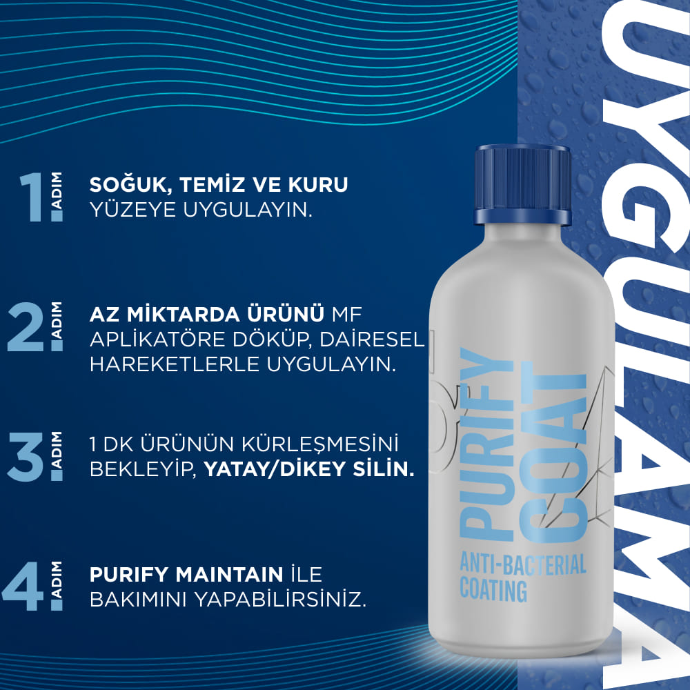 GYEON Q² PurifyCoat, her türlü iç yüzeyde bakteri ve mikrop oluşumunu önlemek için benzersiz bir seramik kaplama teknolojisinden yararlanır. Q² PurifyCoat, atomik düzeyde işlevselleştirilmiş SiO² + Cu²? formülüyle plastik, deri ve kumaşlara görünmez bir anti-mikrobiyal film bırakır. Alkolsüz, %100 doğal bileşenler sayesinde sağlıkla uyumlu; yüzeyde mat, fabrika çıkışı dokuyu korur.