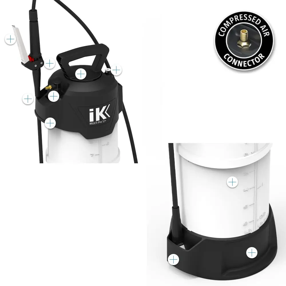 IK MULTI PRO 12+ Plus Hava Kompresör Bağlantılı Basınçlı Pompa, ergonomi, kullanım kolaylığı ve güvenlik açısından maksimum performansı ile tanınır. Çok çeşitli sektörlerde kusursuz sonuçlar elde etmek için profesyonel bir püskürtme çözümü sunar. Kompresör & taşınabilir hava pompaları ya da manuel pompası ile hava basılarak uzun süreli kullanılabilir.