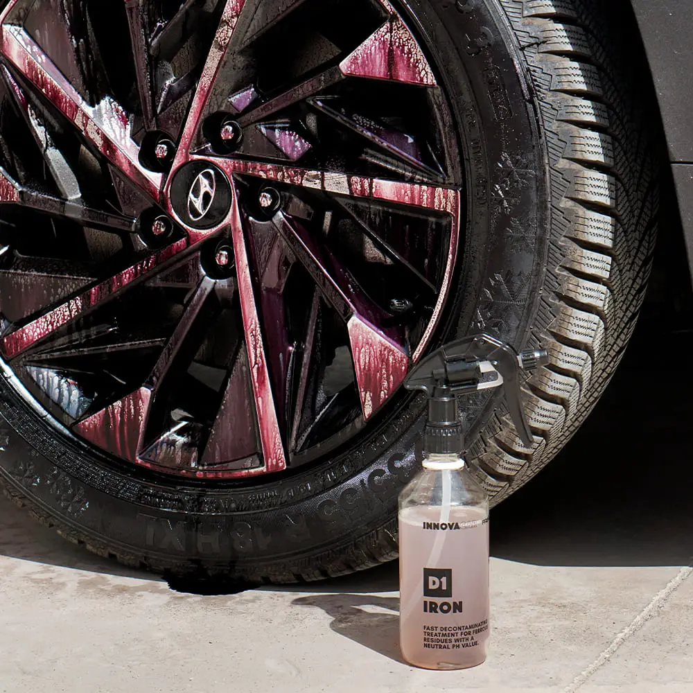 INNOVACAR D1 IRON, jantlar, araç boyası ve camlar üzerindeki ferro partikülleri nazikçe çözen ve seramik kaplama öncesi ideal yüzey hazırlığı sağlayan yüksek konsantrasyonlu bir demir tozu dekontaminantıdır. pH nötr formülüyle hassas yüzeylerde dahi güvenli kullanım sağlar.