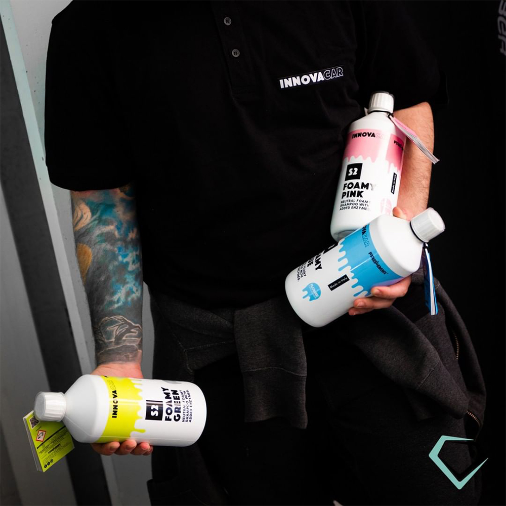 Innovacar S2 Foamy Blue, pH nötr yapısı, canlı mavi köpüğü ve doğadan ilham alan çiçek kokusuyla araç yıkama deneyimini hem keyifli hem profesyonel hale getirir. Derinlemesine temizlik sağlayan patentli enzim teknolojisiyle kaplamalara zarar vermez, etkisini artırır.