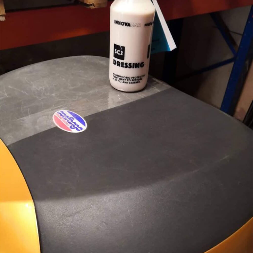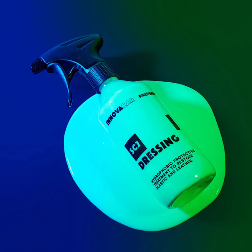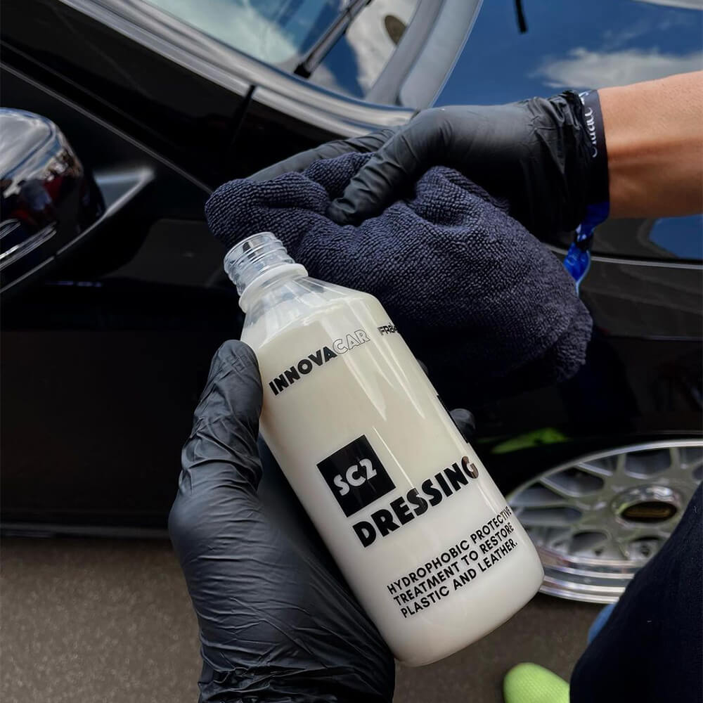 INNOVACAR SC2 DRESSING, plastik, vinil, kauçuk, akrilik ve deri yüzeylerde zamanla oluşan solma, çatlama ve kuruma etkilerini azaltmak ve yüzeylere doğal görünümlü yenileyici bir katman kazandırmak için geliştirilmiş su bazlı, hidrokarbon içermeyen bir bakım ürünüdür.