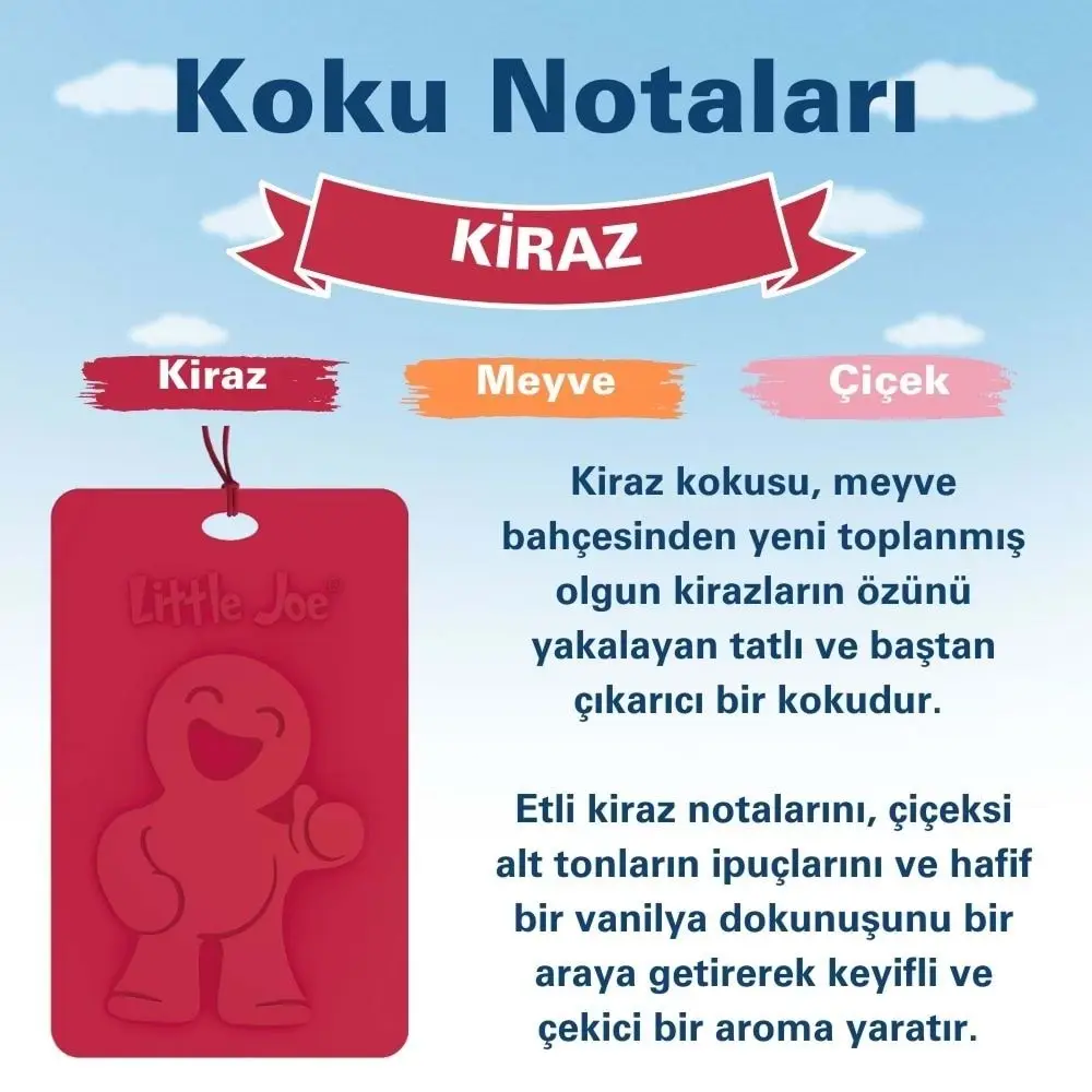 Little Joe kiraz kokusu, polimer kart koku, 45 gün kalıcı oda kokusu, alkol içermeyen koku, meyvemsi kiraz aroması, ferahlatıcı araç kokusu, kiraz aromalı ofis kokusu.