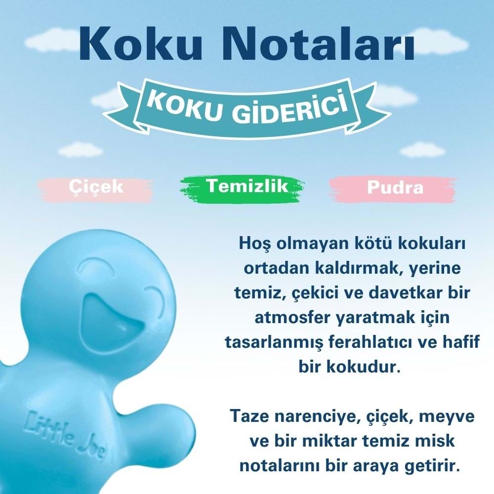Little Joe Koku Giderici, ortamınızdaki kötü kokuları giderirken dengeli ve taze bir hava bırakır. Çöp kokusu, sigara dumanı veya diğer istenmeyen kokuların olduğu yerlerde mükemmel bir performans gösterir. Her kullanımda temiz ve yenileyici bir atmosfer sunar.