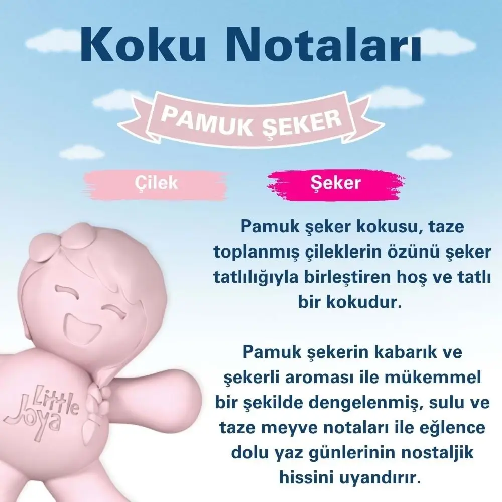 Pamuk Şeker kokusu, tatlı ve hafif aromasıyla bulunduğu ortamı neşelendirir. Rahatlatıcı ve keyif veren bu özel koku, her anınıza tatlı bir dokunuş katar. Little Joya Pamuk Şeker, nostaljik bir atmosfer yaratırken aynı zamanda taze bir hava sunar.