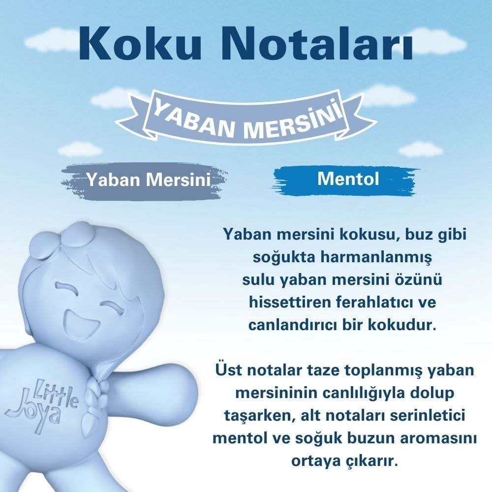 Little Joya Yaban Mersini, taze yaban mersini kokusuyla bulunduğunuz her ortamı zenginleştirir. Şık tasarımı ve uzun süreli etkisiyle hem estetik bir dokunuş hem de ferah bir atmosfer sunar. Yaban mersininin tazeleyici kokusunu hissetmek için Little Joya Yaban Mersini’ni hemen deneyin!