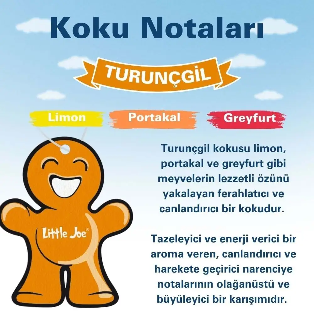 Little Joe turunçgil kokusu, ferah narenciye oda kokusu, uzun süreli araç kokusu, alkol içermeyen koku, tazeleyici asma karton koku.