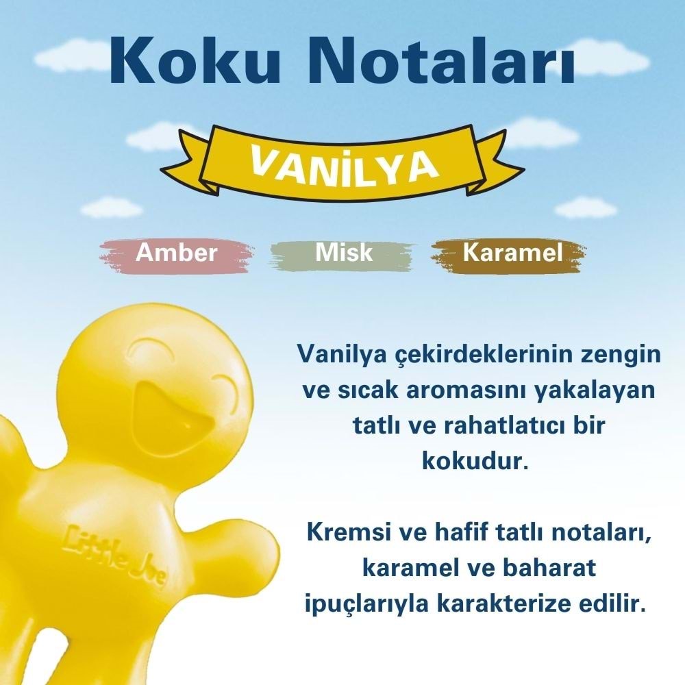 Vanilya, yüzyıllardır sakinleştirici ve rahatlatıcı etkisiyle bilinir. Little Joe Vanilya, bu klasik aromayı modern bir dokunuşla bir araya getirerek hem sıcak hem de tatlı bir koku deneyimi sunar. Vanilyanın huzur verici notaları, stresli günlerinizi geride bırakmanıza yardımcı olurken çevrenizde ferah bir atmosfer yaratır. İster araba yolculuklarında ister evde rahatlamak için kullanın, vanilyanın zamansız cazibesi her ortamı güzelleştirir.